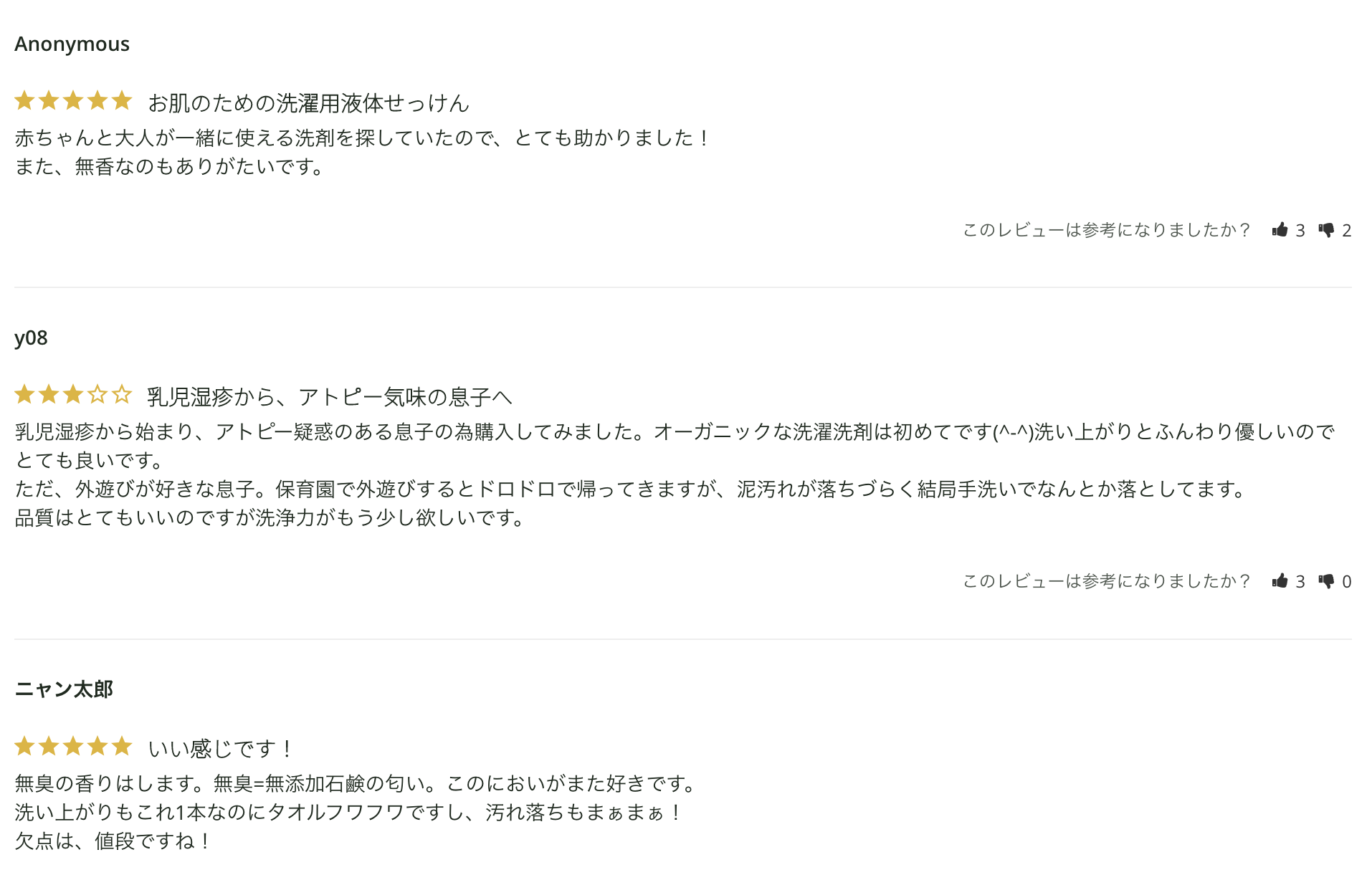 「竹の洗剤は、成分・洗浄力も安心だし、香りも無香料、柔軟剤いらずの洗い上がりで、とても満足しています!